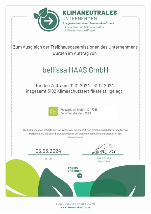 Für die Kompensation unserer Treibhausgase wurden wir als „klimaneutrales Unternehmen“ ausgezeichnet. Damit ist bellissa branchenweit einer der ersten Betriebe, der seine Emissionen gemäß dem Clean-Development-Mechanism freiwillig kompensiert.